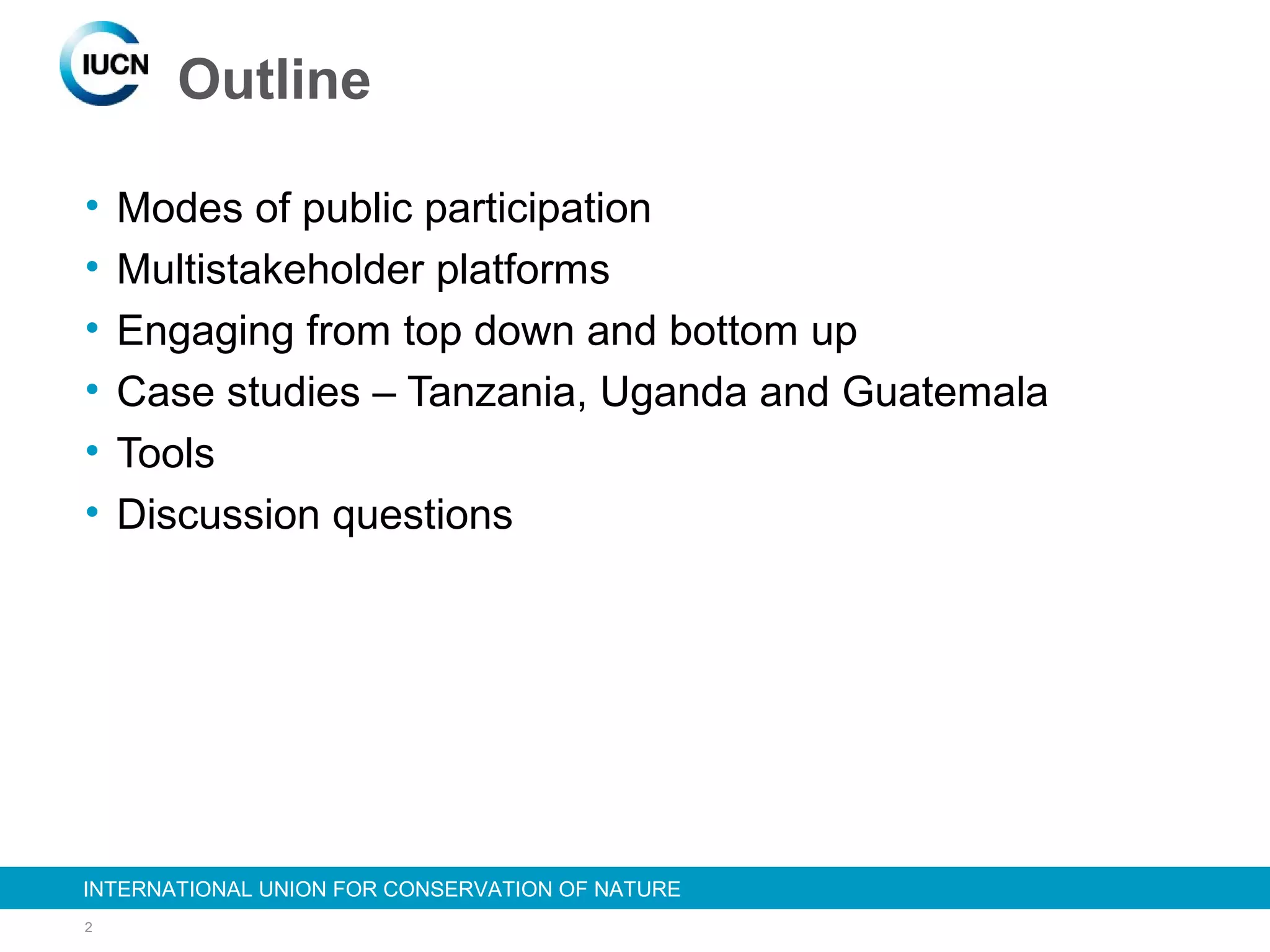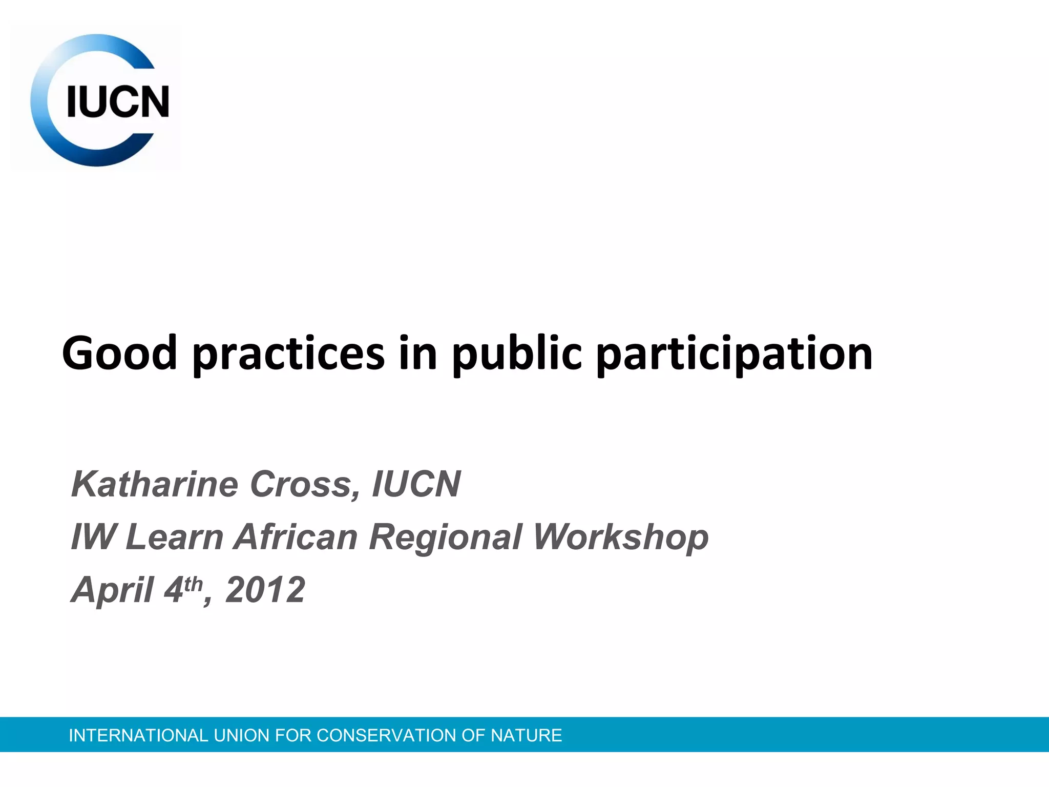 The document discusses good practices in public participation for water governance. It outlines modes of participation including multistakeholder platforms that bring together stakeholders to share knowledge, generate options, and inform decisions. Case studies from Tanzania, Uganda, and Guatemala demonstrate engaging stakeholders from top-down and bottom-up through tools like water user groups and watershed planning. Effective governance requires enabling policies, social learning institutions, decentralized decision-making, coordination across scales, and leadership to build adaptive capacity through participation.