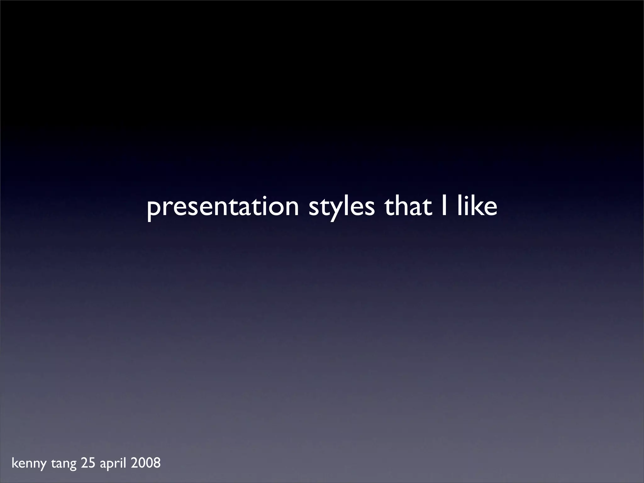 This document discusses presentation styles and attributes that make messages "sticky". It notes that simplicity, unexpectedness, concreteness, credibility, emotions and stories are six key attributes of sticky messages. It provides examples of presentations that demonstrate these attributes well, such as talks by JJ Abrams, Steve Jobs and others. It also discusses avoiding cluttered slides and bullets in favor of more conversational delivery and letting the presenter be the focus.