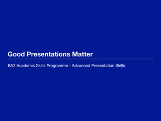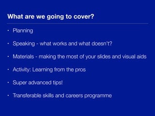 The document outlines advanced presentation skills focusing on planning, speaking techniques, and effective use of visual aids. It emphasizes the importance of audience consideration, structuring main points, and reviewing content to meet objectives. Additionally, it provides tips on visual presentation design and multimedia principles to enhance audience engagement.