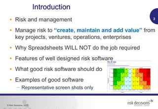 Robust risk management is crucial for business success, as spreadsheets are inadequate for this task due to their limitations in version control, workflow, and security. Effective risk software provides standardization, user configurability, and integrated monitoring capabilities, enhancing collaborative efforts across projects. The document concludes that proper risk management culture and software are essential for sound asset and project management throughout the asset lifecycle.