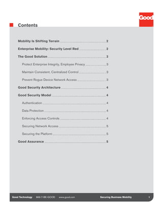 The document discusses securing enterprise data and employee privacy on mobile devices. It summarizes Good Technology's solution which has three main tenets: 1) Respecting enterprise data integrity and employee privacy by containerizing business and personal data; 2) Maintaining consistent, centralized control over all enterprise content; and 3) Preventing rogue device network access by providing visibility into all devices on the network. Good's security architecture uses encryption, authentication, data protection, access controls, and securing the platform and network access to address security challenges of enterprise mobility.