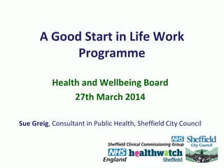 The document outlines the 'A Good Start in Life' work programme overseen by Sheffield's Children's Health and Wellbeing Partnership Board, aimed at improving children's health and wellbeing through four workstreams focused on complex health needs, emotional well-being, healthy child programme delivery, and community engagement. It emphasizes reducing health inequalities and enhancing services for children and young people (0-24 years), ensuring they have a safe and healthy start in life. Future priorities include enhancing early years services and improving emotional wellbeing through universal interventions and active family involvement in the commissioning process.