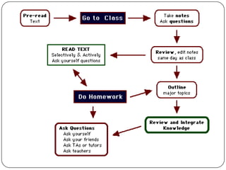 Being a successful college student requires developing good study habits and time management skills. The document outlines responsibilities students should have, such as attending class regularly, completing assignments on time, and following school regulations. It then provides tips for creating an effective study schedule that balances activities and limits study sessions to no more than two hours. Finally, the document lists habits of successful students like planning specific study times, starting and finishing study sessions as planned, reviewing notes before assignments, and calling classmates when help is needed. The overall goal is to help all students improve their study habits and skills to pass courses, finish college, and have a brighter future.