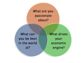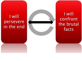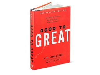The document summarizes key findings from research into organizations that achieved enduring greatness. It identifies six core elements common to these organizations: 1) Level 5 leadership, 2) First getting the right people on the team before deciding on strategy, 3) Confronting brutal facts, 4) Having a simple "Hedgehog concept", 5) A culture of discipline, and 6) Using technology to accelerate momentum, not create it. Each element is then described in more detail.
