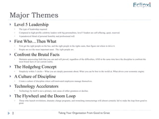 The document discusses key concepts for taking a company from good to great. It discusses the importance of level 5 leadership, which focuses on the company rather than the individual leader. It also emphasizes the need to first get the right people on the team before deciding on strategy ("first who, then what"). Companies must also confront the brutal facts of reality and maintain faith that they can prevail. The hedgehog concept involves focusing on what a company can be best at and is passionate about. A culture of discipline with the right people can avoid bureaucracy and sustain great results.