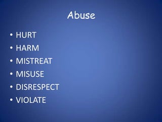 The document discusses good touch versus bad touch, with a focus on sexual abuse. It defines sexual abuse as forced or tricked touching of private body parts, and notes that force is when someone makes a child do something they don't want to or understand. It states that sexual abuse is never an example of good forcing and is never okay. The document also discusses tricks used in sexual abuse, including lying and pretending, and notes private body parts are those covered by a swimsuit or underwear. It raises the question of why we have safety rules.