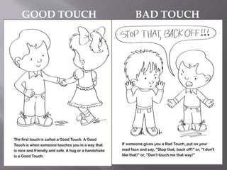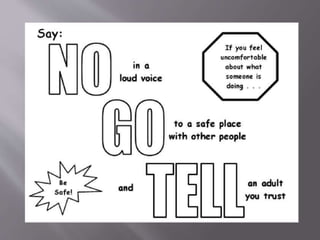This document provides safety tips for children, advising them to never be alone and to always be with someone. It instructs children not to allow anyone to touch their private parts without permission and to tell a parent or teacher immediately if anyone tries to do so or asks them to keep it a secret. The overall message is for children to be bold, safe, and speak up if they feel unsafe or uncomfortable.