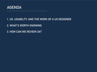1. The document discusses UX design, including defining UX, the work of UX designers, and how to review UX.