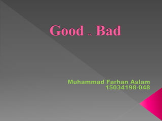 The document discusses the concepts of 'good' and 'bad,' providing definitions and historical context for each. It outlines characteristics of good and bad students, teachers, and leaders, highlighting the importance of ethical behavior and responsibility. Additionally, it emphasizes that the classification of actions or individuals as good or bad depends significantly on context and usage.