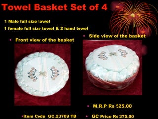 The document lists various gift items being sold by Goodals Chocolate, including towel baskets, flasks, kettles, chocolate boxes, baskets containing chocolates, trays of chocolates, and cotton bed sheets. Each item includes a product code, MRP price, and discounted GC price. The items are intended as gifts and many contain chocolates or dry fruits.
