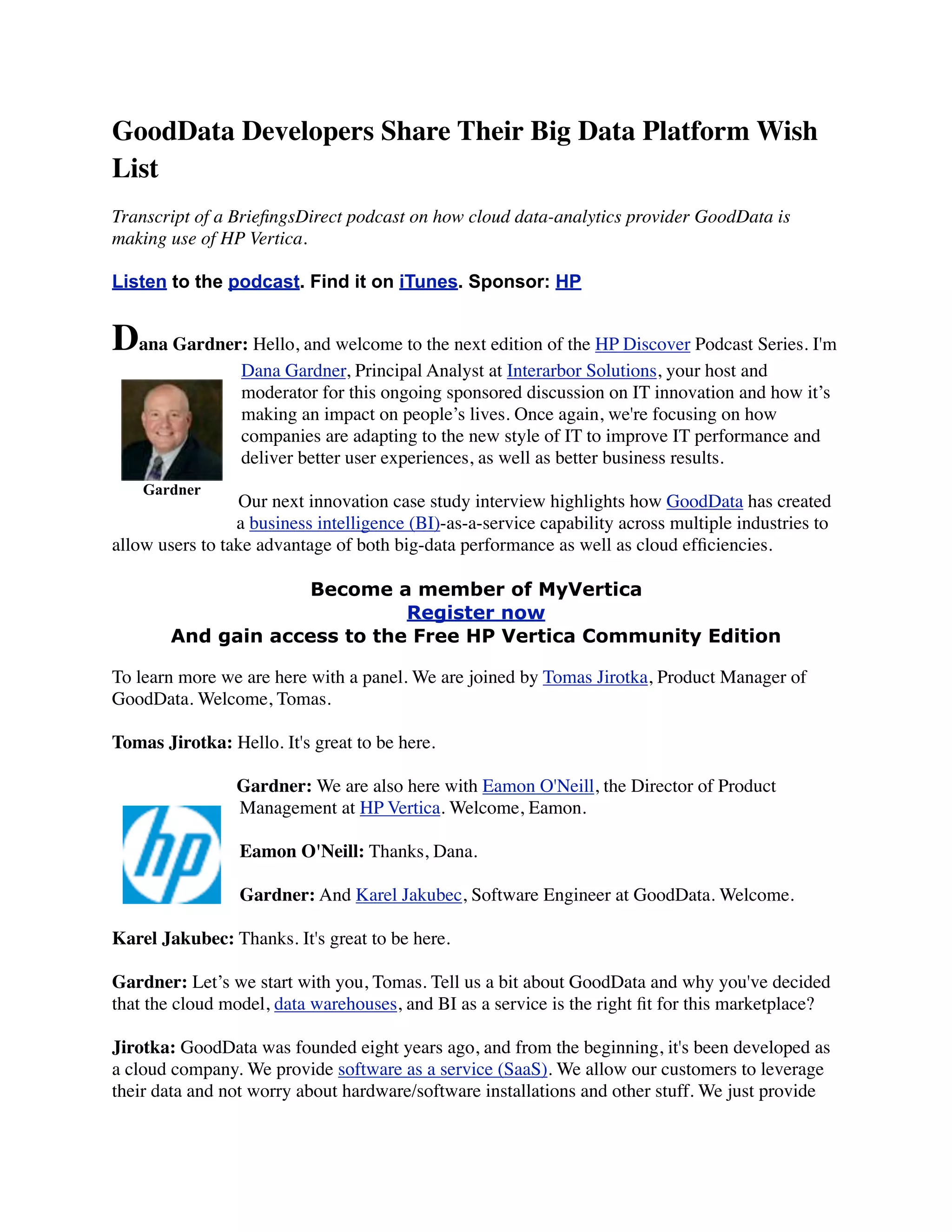The podcast discusses GoodData's use of HP Vertica to enhance their business intelligence-as-a-service offerings. GoodData aims to provide a flexible platform that simplifies data analysis for various industries by leveraging cloud efficiencies and scalable technology. The conversation covers the benefits of real-time analytics, integration with Hadoop, and security features that cater to evolving customer needs.