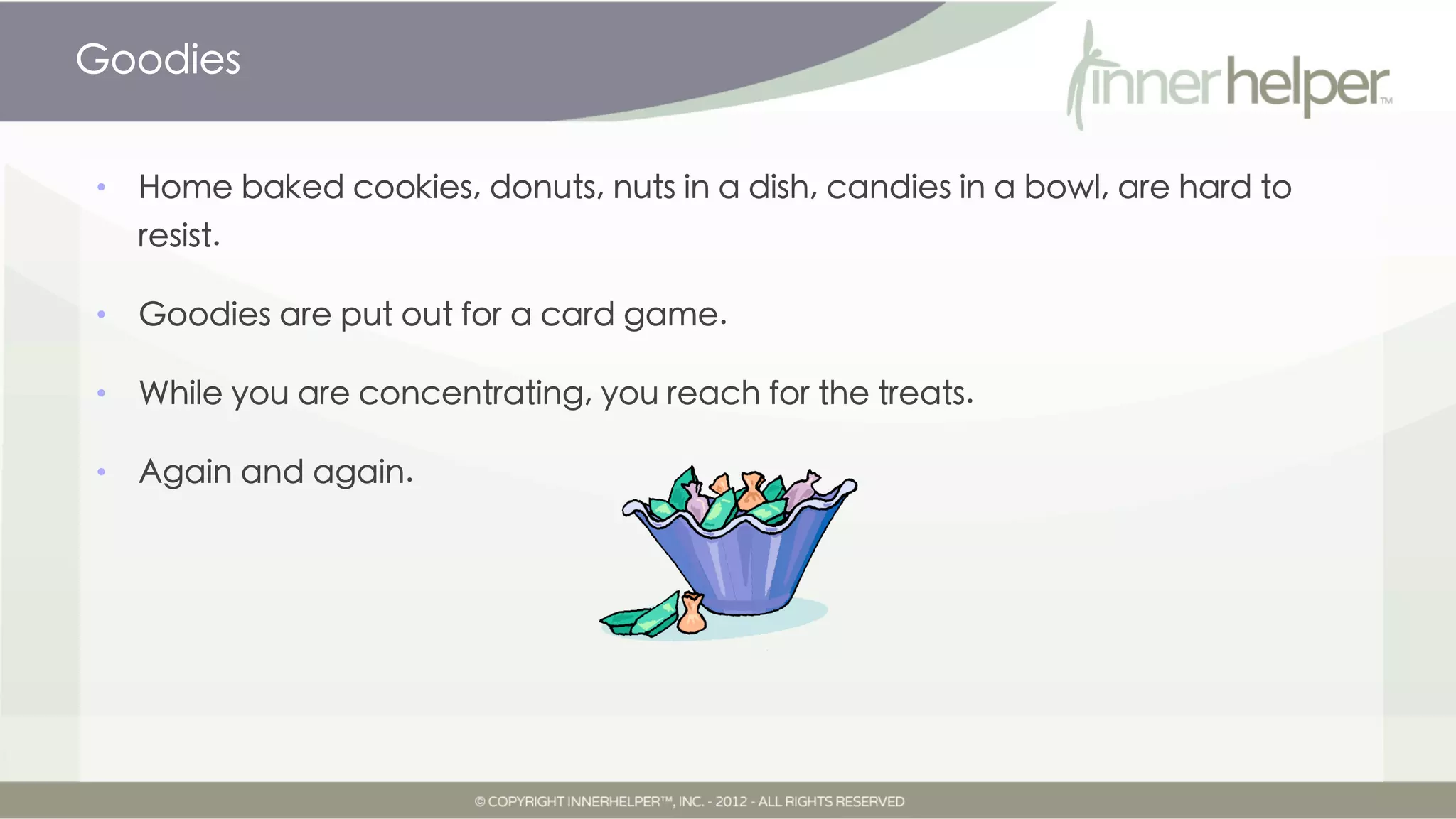 The document discusses the challenges of resisting tempting snacks and sweets, called "goodies", in various social and work settings. It describes how teachers, office workers, and those attending parties and card games often faced plates of cookies, cakes, candies, and other treats that were difficult to avoid eating repeatedly. One person found that bringing diet drinks to a poker game instead of beer helped improve his concentration and performance. The document encourages developing strategies like bringing healthier snacks or using self-reminders to manage urges for high-calorie goodies.
