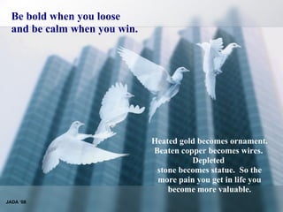 This document contains inspirational sayings and advice about dealing with challenges in life. It suggests that difficulties make a person stronger, like heated gold becoming ornamental or beaten copper becoming wires. It also notes that every successful person has a painful story, and that problems come with solutions. The overall message is that while life has hardships, focusing on personal growth and helping others can lead to positive change.
