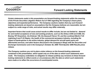 The document discusses Goodrich Corporation's presentation at an aerospace and defense finance conference. It summarizes Goodrich's financial results, portfolio attributes, and themes in the commercial aircraft and defense industries. Goodrich expects continued strong demand for new commercial aircraft and aftermarket services driven by increasing global air travel.