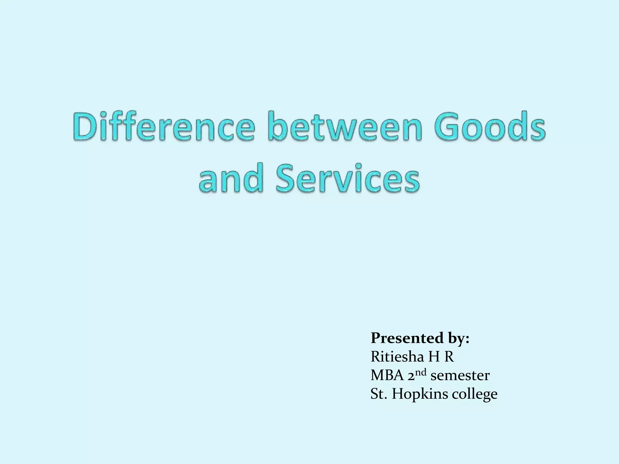 Goods are physical, tangible products that can be seen and touched. They are standardized, produced separately from consumption, and non-perishable. Services are intangible activities performed for someone else's benefit. They involve performance that is simultaneous to production and consumption and are perishable. The key differences between goods and services are that goods are tangible and can be inventoried, displayed, and returned while services are intangible performances that cannot be inventoried, displayed, or returned. Both goods and services work to meet customer wants and needs.