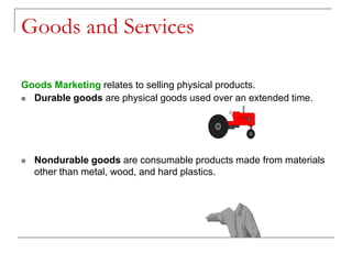 The document discusses different classifications of goods and services. Goods marketing relates to selling physical products that can be durable, lasting over time, or nondurable, meant for single use. Services include rented goods like vehicles or equipment, owned goods services involving repairs, and non-goods services like advice. Some organizations provide hidden services like delivery, installation, training, and maintenance to support goods. The document then outlines various classification systems for goods and services based on factors like market segment, tangibility, regulation, and customer contact. Key attributes of services are discussed as being intangible, perishable, inseparable from the provider, and variable in quality. Finally, a continuum is presented showing how products can range from purely goods to purely