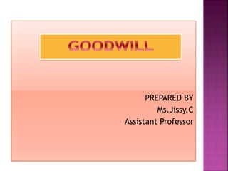 This document discusses different methods for valuing goodwill in a business. It defines goodwill as the reputation or good name of a business that can be expressed in monetary terms. It then explains three methods for calculating goodwill: the average profit method, which multiplies average profits by the number of years purchased; the super profit method, which considers excess profits over a normal rate of return; and the capitalization method, which calculates the capital needed to generate average profits based on a normal rate of return. For each method, it provides an example calculation to illustrate how to apply the method.