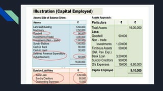 The document outlines the calculation of goodwill using the super profit method, emphasizing the formula: goodwill equals super profit multiplied by the number of years purchase. It explains super profit as the difference between actual/average profit and normal profit, with normal profit determined by the capital employed and a specific rate. Capital employed is calculated through asset and liabilities approaches, accounting for investments, fictitious assets, and partnerships.