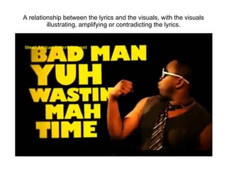 This document outlines several elements that are often present in music videos including: a relationship between the lyrics/music and visuals where the visuals illustrate, amplify, or contradict the lyrics/music; genre-related style and iconography; multiple close-ups of the main artist or vocalist; and voyeurism, especially regarding females, often playing a major role. Intertextual references to other media texts may also be present.