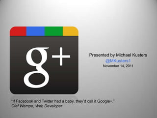 The document discusses Google+, a social media platform launched by Google. It provides an overview of Google+'s features such as Circles for organizing contacts, Hangouts for video chatting, and Sparks for personalized content. The document also outlines how Google+ can benefit businesses through features like improved analytics and customer engagement capabilities. However, it notes some criticisms of Google+ including that the mobile apps are only available on Android and iPhone and that it has been in beta testing too long.