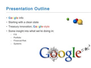 The document discusses Google's mission to organize the world's information and make it universally accessible and useful. It outlines Google's strategy of focusing on search, ads, and apps. It also provides various data points about Google's search usage, advertiser base, and YouTube viewership. The document then shifts to discussing starting a treasury function from a clean slate, with a focus on areas like foreign exchange, portfolio management, and financial risk systems.