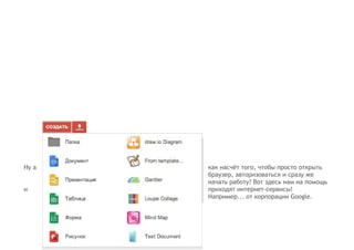 Сервис Google Документы позволяет создавать и редактировать документы онлайн, предоставляя возможность совместной работы с другими пользователями в реальном времени, комментирования и изменения доступа. Пользователи могут автоматически сохранять изменения, публиковать документы в Интернете и экспортировать их в различные форматы. Google Cloud Connect интегрирует функционал Google Документов с Microsoft Office, обеспечивая синхронизацию и совместное редактирование документов.