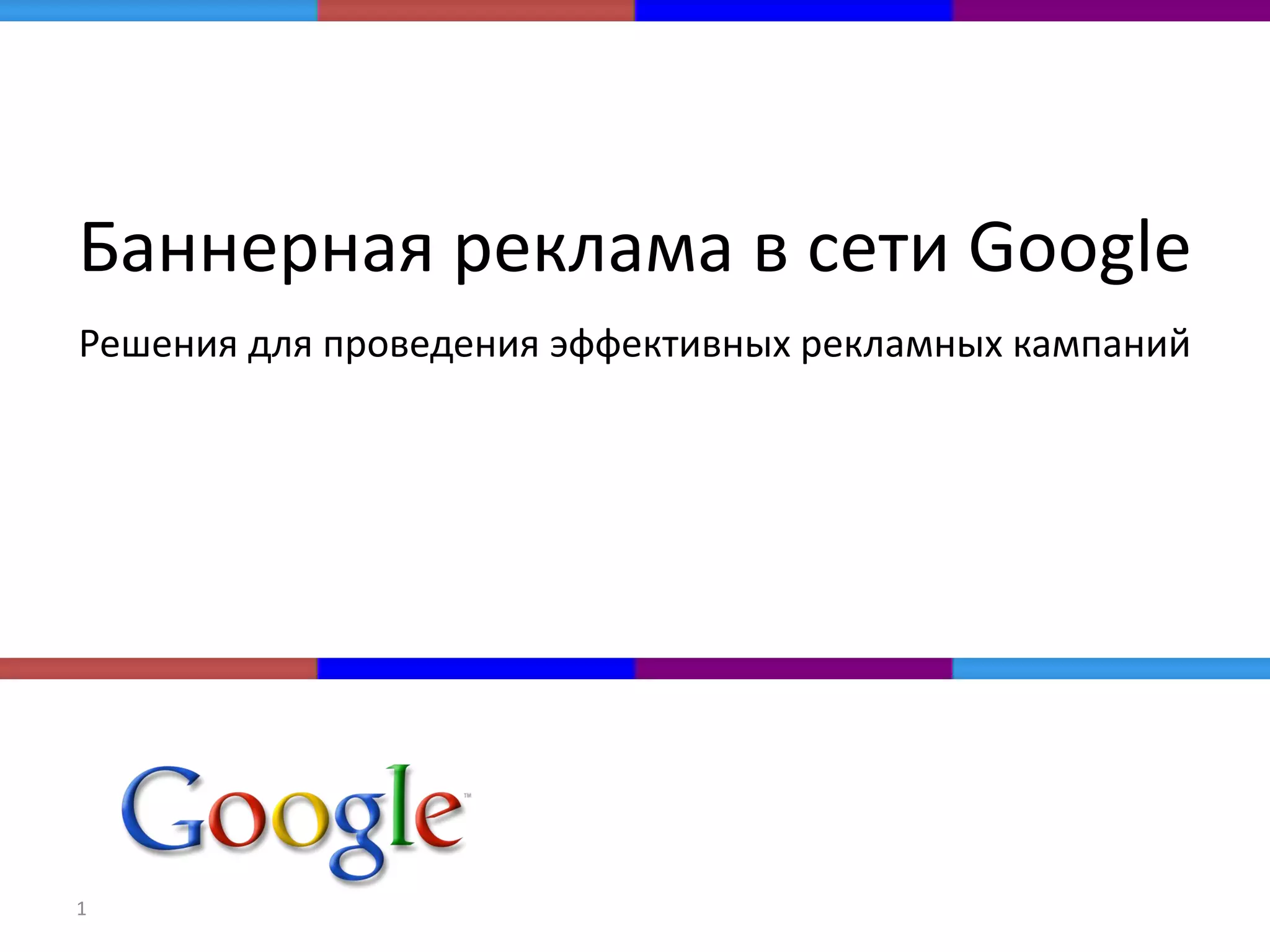 Документ описывает возможности использования баннерной рекламы в сети Google для проведения эффективных рекламных кампаний с охватом более 60% пользователей рунета. Приводятся решения для повышения узнаваемости бренда и целевой маркетинг, включая контекстный таргетинг, маркетинг на основе интересов и ремаркетинг. Кроме того, упоминается автоматизация оптимизации медийных кампаний с целью достижения большего количества конверсий.