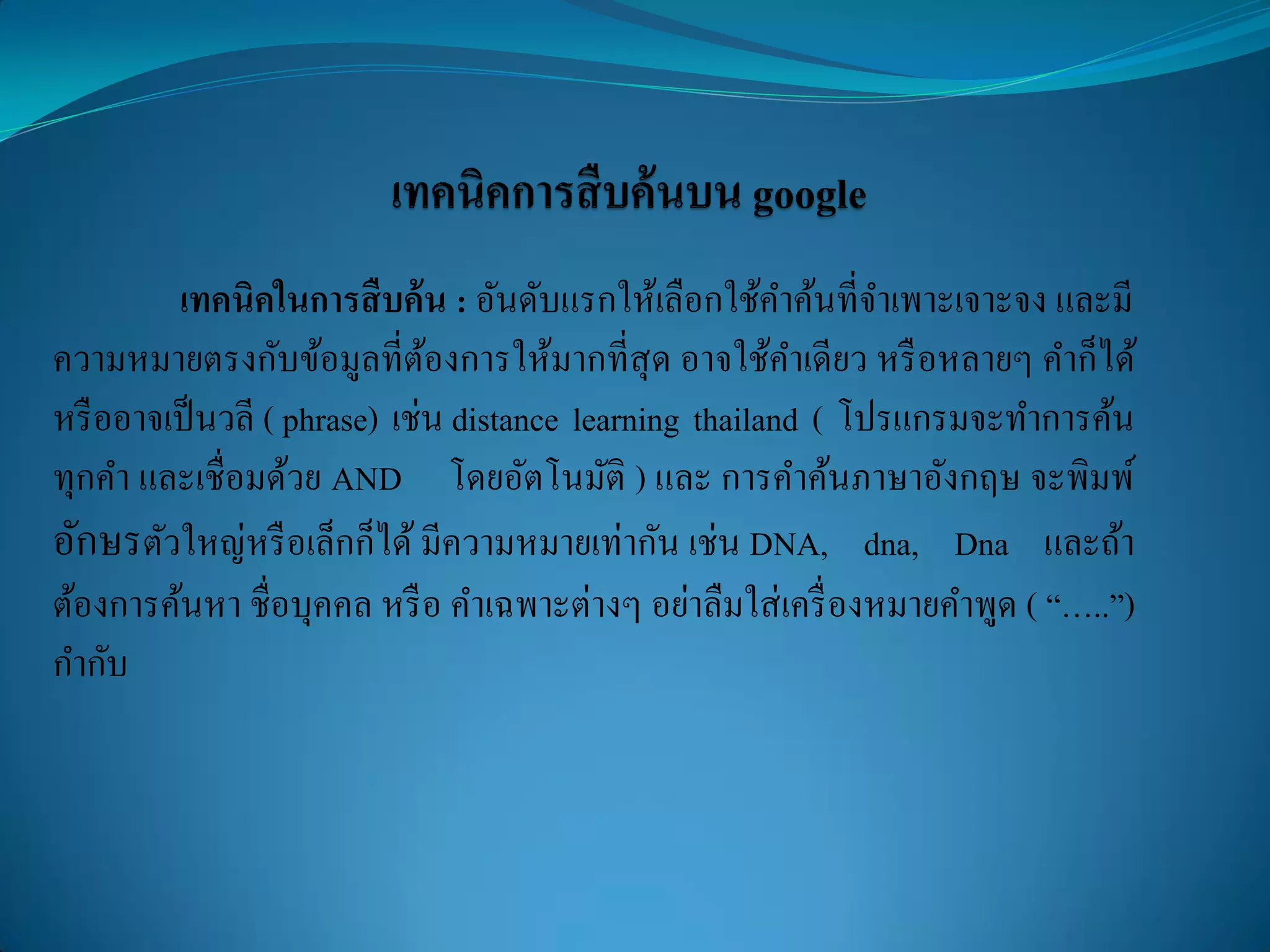 เทคน คการส บค_นบน google 1. เทคนิคในการสืบค้น : อันดับแรกให้เลือกใช้คาค้นที่จาเพาะเจาะจง และมี