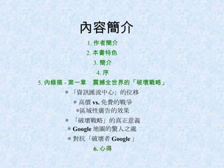 簡介 1. 既有的商業模式維繫的價值觀正逐一被「破壞」2. 進行這場破壞的黑手就是搜尋引擎巨人—— Google 。 3. Google 正以其強大的廣告活動為背景,試圖破壞舊有的秩序、與傳統企業的商業模式。 4.Google 正本著長尾精神,試圖振興中小企業、創造出嶄新的市場。 5.Google 成為大眾發表訊息的幫手,讓大家得以與企業、政府等強權站在同一條線上競爭。 6.Google 也試圖在這類新秩序中,成為一個執掌一切的強大「祭司」。