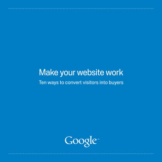 Ten ways to convert visitors into buyers outlines ten tips for making websites more effective at converting visitors into customers. The tips include bringing visitors to the right landing page from advertisements, making the homepage useful, helping visitors navigate the site, improving search results, clearly displaying product groups, providing necessary product details, making registration optional, streamlining the purchasing process, reassuring visitors, and offering to provide further assistance to implement the tips. The document provides examples of companies that increased conversions by implementing some of the tips. It encourages testing changes using analytics and optimization tools.
