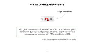 Документ описывает основы разработки расширений для браузера Google Chrome, включая их функциональность и структуру. Основное внимание уделяется manifest.json, который является ключевым компонентом расширения, и различным API, доступным для использования. В документ также включен пошаговый процесс создания простого расширения, отслеживающего изменения cookie.