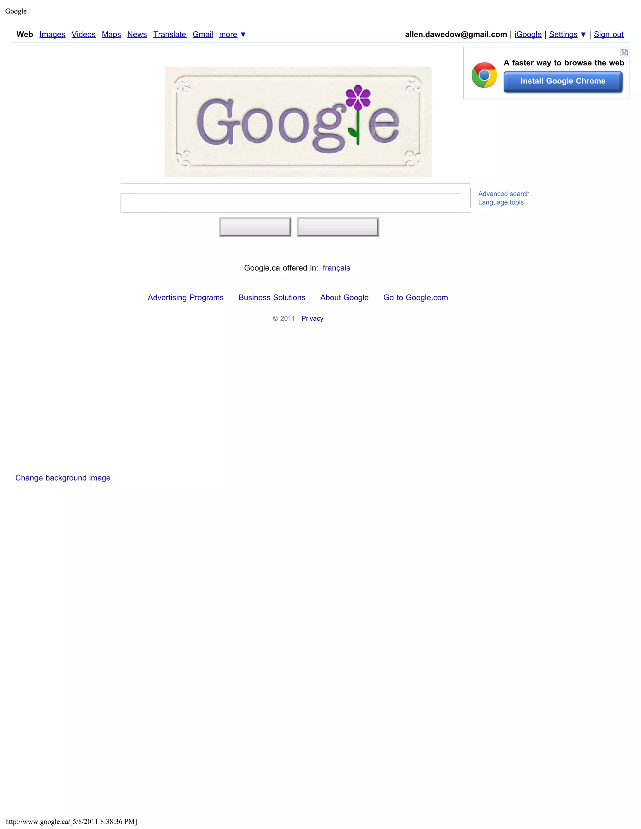 This document provides information about Google and its various services. It includes links to search Google, access Google images, videos, maps and news. It also links to Google translate, Gmail and other Google services. The document encourages installing Google Chrome for a faster web browsing experience and includes options to change the background image or sign out of your Google account.