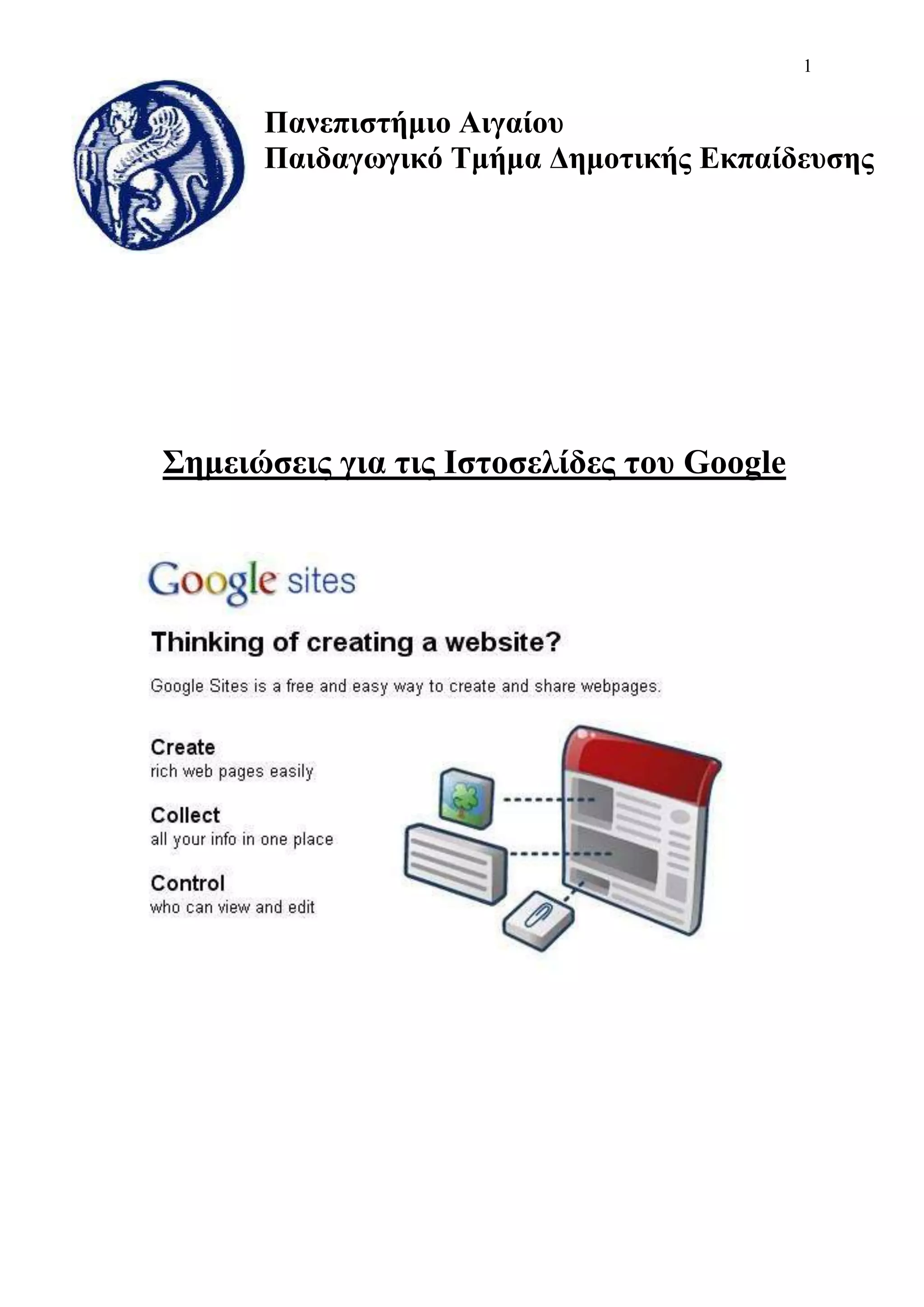 Πανεπιστήμιο ΑιγαίουΠαιδαγωγικό ΤμήμαΔημοτικής Εκπαίδευσης<br />Σημειώσεις για τις Ιστοσελίδες του Google<br />Βήμα 1ο<br />Μπαίνουμε στην σελίδα της Google για τις ιστοσελίδες (http://sites.google.com).<br />0548640Εναλλακτικά, μπαίνουμε στο http://www.google.com, επιλέγουμε περισσότερα και Ιστότοποι ή ακόμα περισσότερα και στη συνέχεια Ιστότοποι.<br />Στην σελίδα που εμφανίζεται, ακολουθώντας την τελευταία διαδρομή, υπάρχουν όλες οι υπηρεσίες της Google (Blogger, Gmail, Picasa, Ημερολόγιο, Έγγραφα κλπ). <br /> <br />3771900114300Βήμα 2ο<br />Εάν έχουμε ήδη λογαριασμό στο Google Sites, πληκτρολογούμε το E-mail (1) και το Password (2) και πατάμε το κουμπί Σύνδεση.<br />Εάν δεν έχουμε λογαριασμό, πατάμε τον σύνδεσμο Sign up for Sites (3) και συμπληρώνουμε την αντίστοιχη φόρμα.<br />Απαραίτητη προϋπόθεση είναι να έχουμε ήδη έναν λογαριασμό e-mail.<br />Βήμα 3ο<br />Με την είσοδό μας στον λογαριασμό, βλέπουμε την παρακάτω οθόνη:<br />Κουμπί δημιουργίας νέου site.Λίστα με τα sitesΣτο συγκεκριμένο παράδειγμα υπάρχει μόνο το site testing. Για τροποποίηση ή επισκόπηση, πατάμε τον αντίστοιχο σύνδεσμο.Αποσύνδεση από τον λογαριασμό.<br />Δημιουργία ενός site – πράξη #1<br />Επιλέγουμε, αν θέλουμε, την μορφή που θα έχει το site μας……ή το σχεδιάζουμε από την αρχή.Πληκτρολογούμε το όνομα του site.Συμπληρώνουμε την διεύθυνση (url).Έχοντας πατήσει το κουμπί Create new site, εμφανίζονται οι παρακάτω επιλογές:<br />Σημείωση: Στο συγκεκριμένο παράδειγμα, η διεύθυνση του site θα είναι:<br />http://sites.google.com/site/myschool<br />Επιλέγουμε το θέμα του site, εφόσον το επιθυμούμε, πατώντας αρχικά το εικονίδιο με το “+”……και αντίστοιχα κάνουμε και για κάποιες επιπλέον επιλογές που μπορούμε να προκαθορίσουμε.<br />Κάποια από τα θέματα που μπορούμε να επιλέξουμε:<br />Επιλογές που θέλουμε να εφαρμόσουμε.Κωδικός ασφαλείας.Δημιουργία του site.<br />Υποσημείωση<br />Οι παραπάνω επιλογές μπορούν να μεταβληθούν οποτεδήποτε θελήσουμε να τις αλλάξουμε.Δημιουργία ενός site – πράξη #2<br />-457200490855Έχοντας επιλέξει την επιλογή “Blank template”, θα εμφανιστεί η παρακάτω οθόνη:<br />Οι βασικές περιοχές που παρατηρούμε από επάνω προς τα κάτω, είναι οι εξής:<br />Σύνδεσμοι που μας οδηγούν στις αντίστοιχες υπηρεσίες του Google.<br />Σύνδεσμοι που μας οδηγούν στις αντίστοιχες οθόνες διαχείρισης των ιστοτόπων του λογαριασμού μας.Αποσύνδεση απ’ τον λογαριασμό μας.<br />Συγκεκριμένα:<br />User settings<br />0960755Μας οδηγεί στην οθόνη διαχείρισης στην οποία μπορούμε να καθορίσουμε την χρησιμοποιούμενη γλώσσα (I), την ρύθμιση που αφορά τη ζώνη ώρας (IΙ) καθώς και αν επιθυμούμε να λαμβάνουμε e-mail με τις αλλαγές που λαμβάνουν χώρα στον ιστότοπό μας, στον λογαριασμό e-mail που έχουμε δηλώσει (IΙΙ).<br />My sites<br />Μας οδηγεί στην λίστα με τους ιστότοπούς μας.<br />-685800630555Στο παρόν παράδειγμα, η λίστα μας περιλαμβάνει δύο sites, το diogenisal2 και το Δοκιμαστικό.<br />Help<br />Μας οδηγεί στην σελίδα παροχής βοήθειας του Google για τα sites.<br />Στη συνέχεια της οθόνης που εμφανίζεται στο βήμα Δημιουργία ενός site – πράξη #2, παρατηρούμε την παρακάτω εργαλειοθήκη:<br />Δημιουργία - επισύναψη νέας σελίδας στο site μας.Αλλαγή/ διαμόρφωση της ενεργής σελίδας.Επιπλέον ενέργειες.<br />Περισσότερες λεπτομέρειες για τα στοιχεία της εργαλειοθήκης, θα βρείτε στη συνέχεια των σημειώσεων.<br />Τέλος, βλέπουμε την διάταξη του site μας, με τα στοιχεία που περιέχει αρχικά.<br />Κεφαλίδα: Τίτλος.Κεφαλίδα: Πεδίο αναζήτησης στην ιστοσελίδα μας.ΥποσέλιδοΑρχική σελίδα (HOME).Αριστερή στήλη (sidebar).<br />Περισσότερες λεπτομέρειες για τα τις λειτουργί