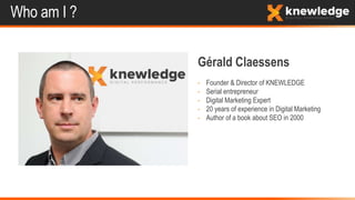 Gérald Claessens, founder of Knewledge, is a digital marketing expert with 20 years of experience, focusing on data-driven strategies for businesses. The document outlines the company's mission to enhance online visibility and conversions through Google Ads and related platforms, emphasizing the importance of understanding audiences and optimizing campaigns based on performance metrics. Key discussions include the differences between SEO and SEA, audience targeting, remarketing strategies, and conversion tracking techniques.