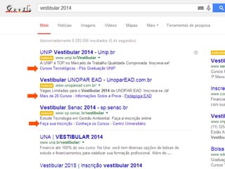 O documento fornece instruções sobre como planejar anúncios no Google Adwords. Ele discute seis etapas básicas para criar uma conta e campanha Adwords, incluindo escolher palavras-chaves relevantes e atraentes textos e anúncios. Também discute ferramentas como Google Trends e Übersuggest para analisar tendências e concorrência.