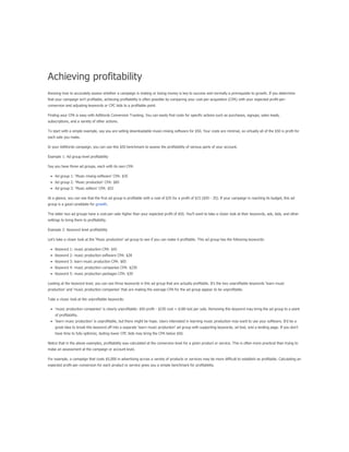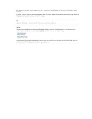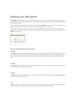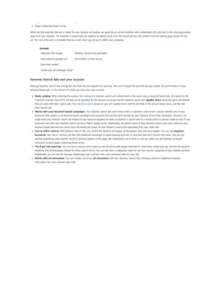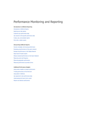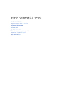 The document provides guidance on using keyword match types in Google Ads to control ad visibility based on customer searches. It discusses four main match types—broad, phrase, exact, and negative—and their implications for ad targeting and traffic quality. Additionally, it emphasizes a strategy of starting with broad match keywords to maximize ad exposure, followed by performance monitoring to refine keyword choices for enhanced relevancy.