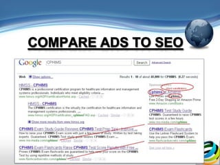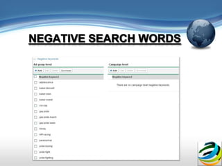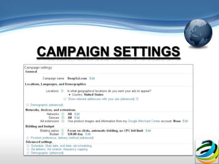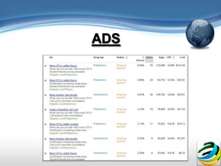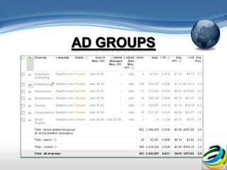 The document discusses Google AdWords and how it works. It explains that Google is worth billions because of targeted web advertising and that AdWords allows businesses to set up advertising campaigns with ads, search words, and landing pages. It provides tips for businesses on using AdWords effectively, such as starting with a low budget, carefully choosing search words, and monitoring which ad versions receive more clicks.