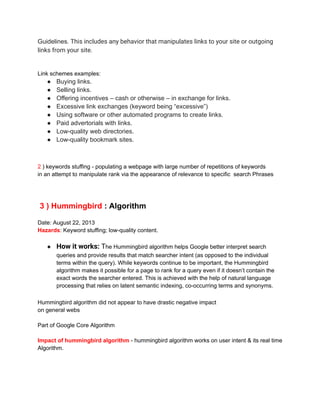 The document discusses various Google algorithms affecting SEO, including Panda, Penguin, Hummingbird, and others, outlining their release dates, objectives, and the issues they address such as duplicate content, keyword stuffing, and user intent. It emphasizes the importance of quality content, user experience, and natural language processing in improving search rankings. Additionally, it highlights the impact of updates like Mobilegeddon and BERT on mobile-friendliness and understanding complex search queries.