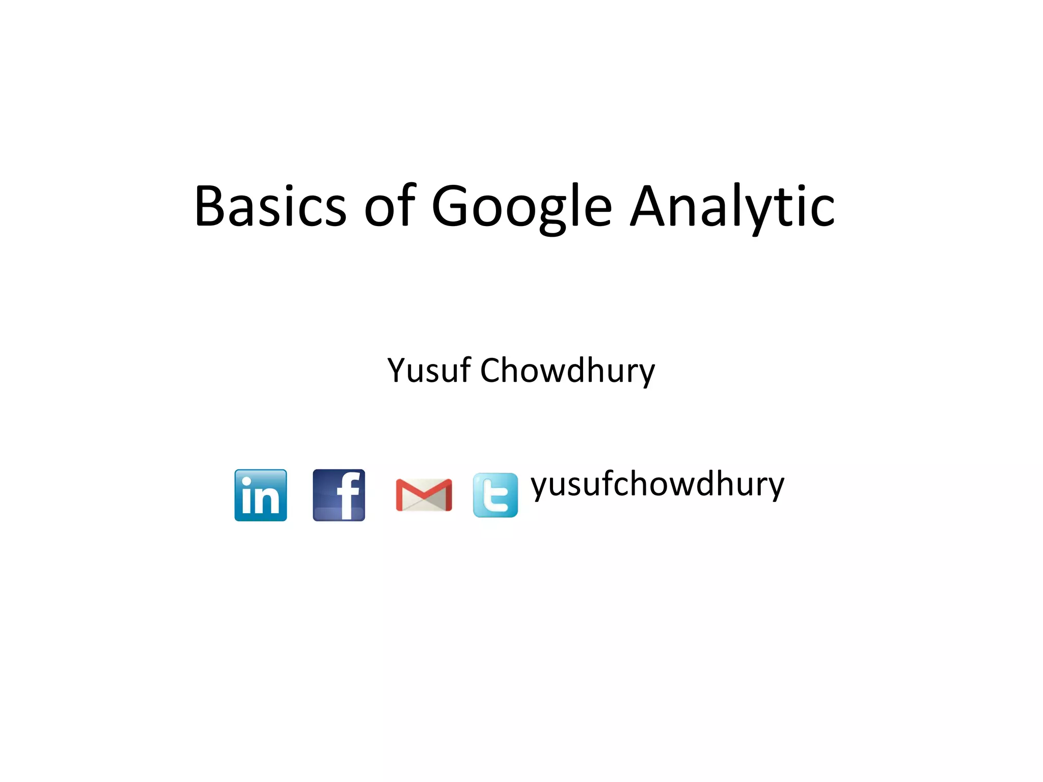 This document provides an overview of Google Analytics and how to use it to understand website traffic and improve marketing efforts. It discusses how Google Analytics can help understand how visitors use sites, make marketing campaigns more effective, and create valuable content. It then covers how to set up a Google Analytics account, install the tracking code, set goals and goal pages to measure key business metrics like sales or signups. Finally, it discusses how to use Google Analytics to analyze traffic sources, best and worst performing content, and bounce rates to build growth.