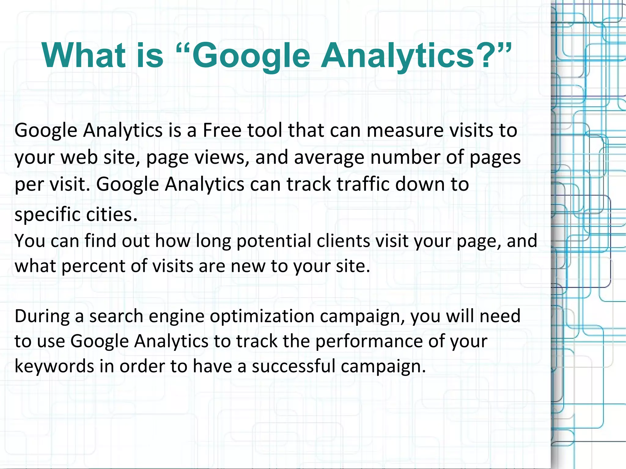 Google Analytics is a free tool that can track website traffic, page views, and average pages per visit. It can track traffic down to specific cities and show how long visitors spend on pages and what percentage are new versus returning. Google Analytics has intuitive interfaces and features like site overlays, geo-targeting, email reports, visitor segmentation, and funnel and trend visualizations to analyze bounce rates, navigation, and conversion funnels. Using Google Analytics, businesses can improve pages and links, modify checkout processes, track referral sources, and gain more customers by understanding website usage and traffic.