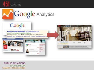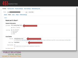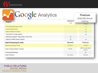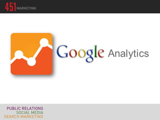 Google Analytics is a free service offered by Google that generates detailed website visitor statistics. It is used by 55.8% of all websites and has an 81.5% market share. The Google Analytics Tracking Code is a piece of JavaScript code that is added to every page of a website to track visitor behavior. Google Analytics allows users to measure metrics like total traffic, page views, visitor locations, and goals/conversions in reports that can be filtered by date ranges and dimensions.