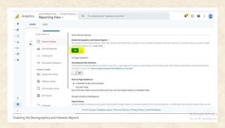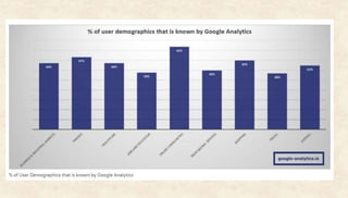 The document discusses tracking unique visitors and user demographics in Google Analytics. It explains that unique visitors refers to unduplicated visitors within a time period. To track user demographics, advertising features must be enabled for the property and demographic reports enabled. Google Analytics obtains demographic data like age and gender from Google user accounts, third-party cookies, and mobile advertising IDs. However, demographic data is only available for a subset of users. The document also discusses how to analyze demographic and interest data to find the most converting groups to target marketing towards.