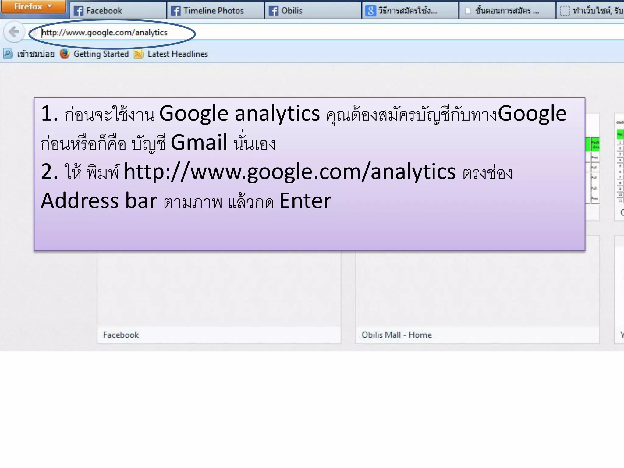 analytics คุณต้องสมัครบัญชีกับทางGoogle ก่อนหรือก็คือ บัญชี Gmail นั่นเอง 2. ให้ พิมพ์ http://www.google.com/analytics ตรงช่อง Address bar ตามภาพ แล้วกด Enter
