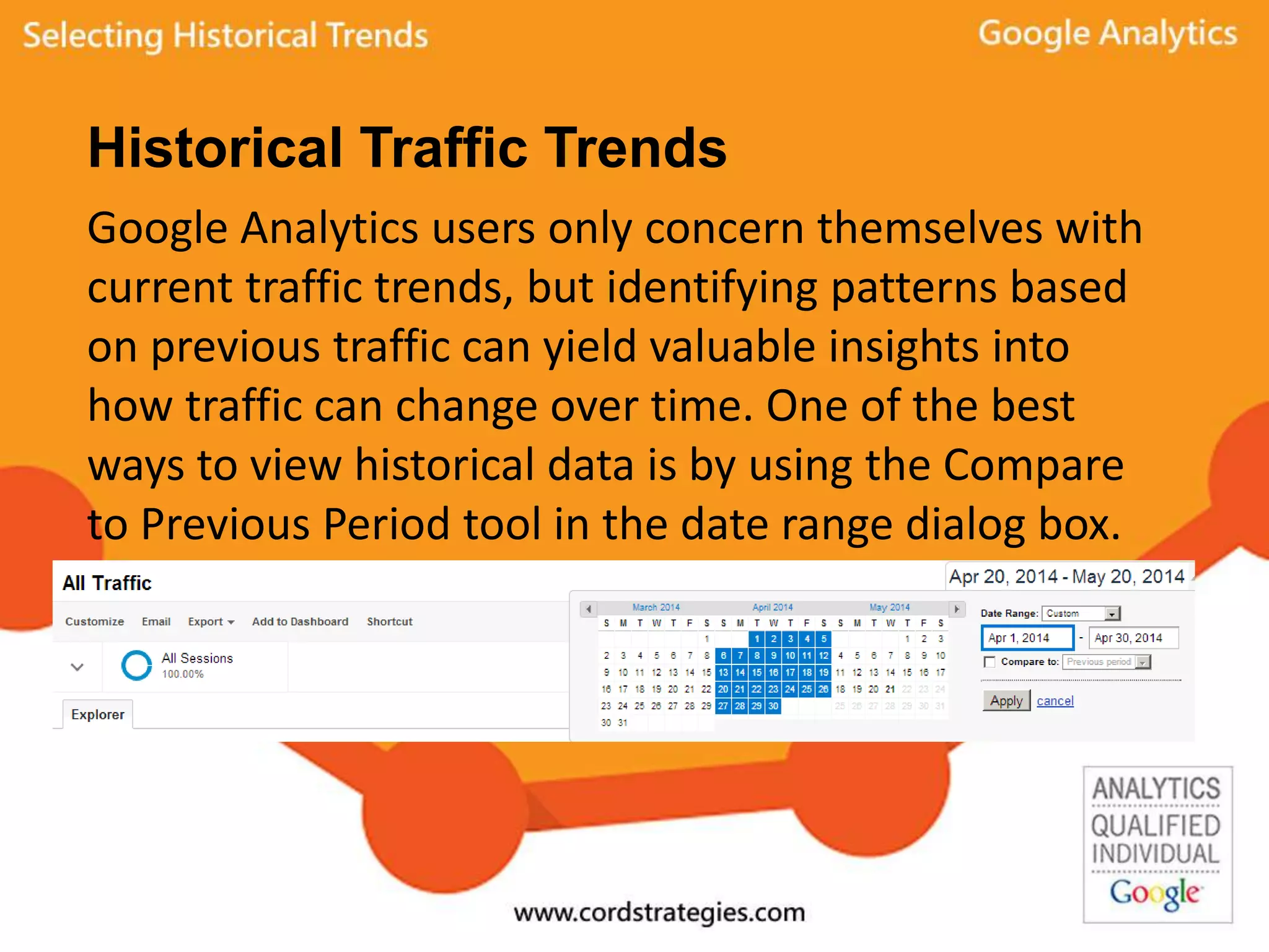 Google Analytics allows users to compare historical traffic trends over different time periods. When comparing a selected date range to the previous period, the days of the week may not match up exactly. This can yield inaccurate results when analyzing weekly patterns. To ensure an accurate comparison of the same days of the week, users need to manually enter custom date ranges where the days match perfectly between the periods.