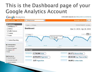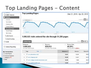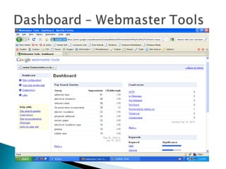 The document discusses the role of analytics and webmaster tools in the SEO process, emphasizing their importance for understanding traffic sources, visitor behavior, and performance metrics. It highlights key concepts such as bounce rate, average time on site, and various traffic sources, including direct, referring, and search engines. Additionally, it mentions the necessity of having a sitemap and the importance of reviewing and correcting crawl errors and HTML suggestions.