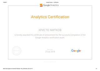 This certificate from Google awards Xristo Mitkov for successfully completing the Google Analytics certification exam. The certificate is valid until July 27, 2018 and was issued on January 30, 2017 by Google Partners for certification in analytics.