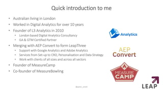 The document is a crash course by Peter O'Neill on Google Analytics, offering 25 tips and tricks to enhance digital analytics in a concise 30-minute session. It emphasizes the importance of understanding user needs, creative tracking solutions, and effective configuration for better performance insights. Key points include capturing relevant data, setting up comprehensive goals, and creating useful reports tailored to business needs.