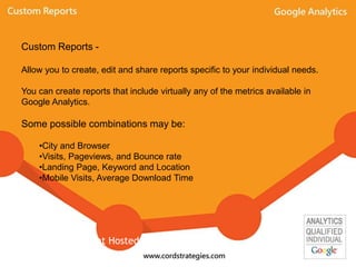 The document covers the creation and customization of reports in Google Analytics, allowing users to specify dimensions and metrics tailored to their needs. Users can filter data and create multiple tabs for different views, and they can also import existing reports for guidance. Key components include understanding dimensions (descriptive data) and metrics (numeric measurements), as well as available combinations for effective reporting.