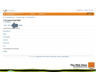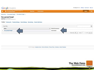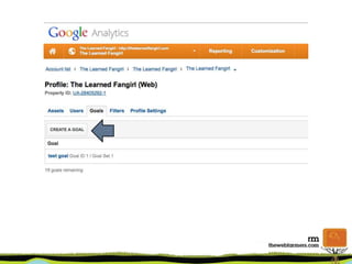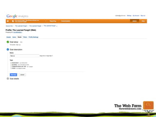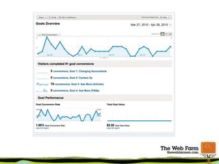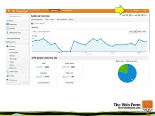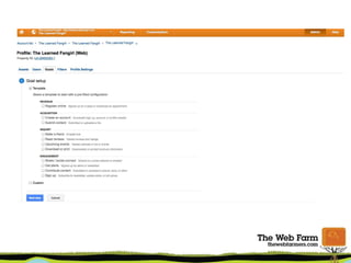 The document provides an overview of using Google Analytics for small businesses. It covers key metrics to measure like top keywords, referring websites, content popularity and bounce rate. It discusses setting up accounts and tracking codes, as well as setting up goals and conversions. Additional topics include new vs returning visitors, custom dashboards, and resources for learning more about Google Analytics.