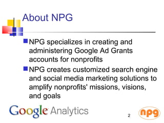 This document provides an overview of how nonprofits can use Google Analytics to understand visitors to their website. It discusses tracking where visitors are located, how they arrived at the site, why they visited, where they go on the site, what devices they use, and whether they are achieving the organization's goals. The document recommends nonprofits define metrics and targets to evaluate performance and determine how to improve engagement and traffic.